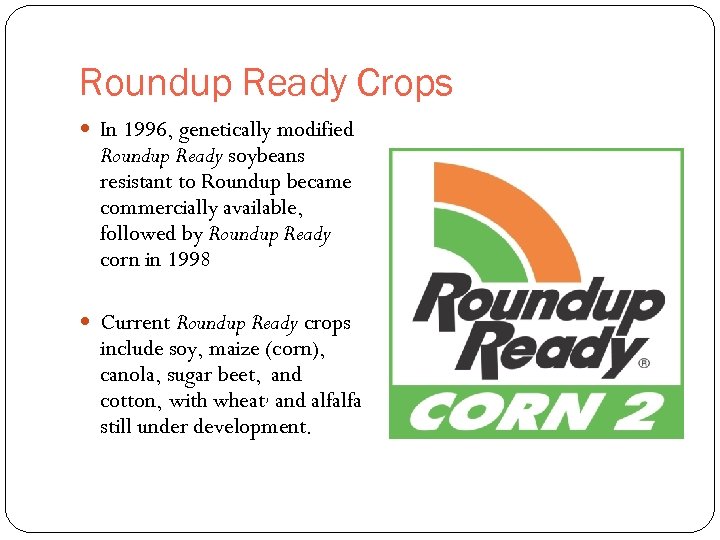 Roundup Ready Crops In 1996, genetically modified Roundup Ready soybeans resistant to Roundup became commercially available, followed by Roundup Ready corn in 1998 Current Roundup Ready crops include soy, maize (corn), canola, sugar beet, and cotton, with wheat, and alfalfa still under development.