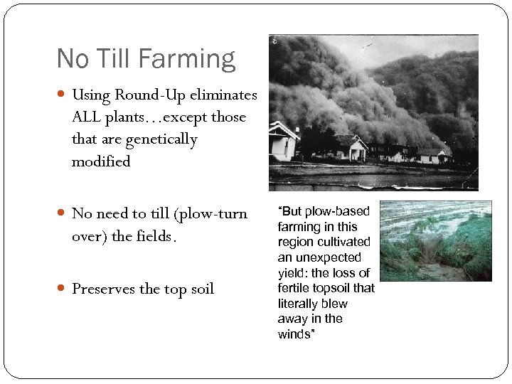 No Till Farming Using Round-Up eliminates ALL plants…except those that are genetically modified No need to till (plow-turn over) the fields. Preserves the top soil “But plow-based farming in this region cultivated an unexpected yield: the loss of fertile topsoil that literally blew away in the winds”