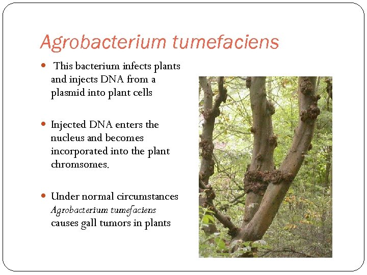 Agrobacterium tumefaciens This bacterium infects plants and injects DNA from a plasmid into plant cells Injected DNA enters the nucleus and becomes incorporated into the plant chromsomes. Under normal circumstances Agrobacterium tumefaciens causes gall tumors in plants