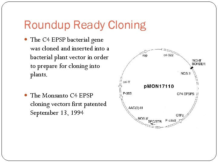 Roundup Ready Cloning The C 4 EPSP bacterial gene was cloned and inserted into a bacterial plant vector in order to prepare for cloning into plants. The Monsanto C 4 EPSP cloning vectors first patented September 13, 1994