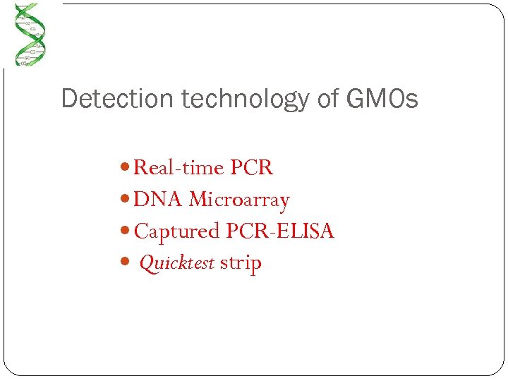 Detection technology of GMOs Real-time PCR DNA Microarray Captured PCR-ELISA Quicktest strip