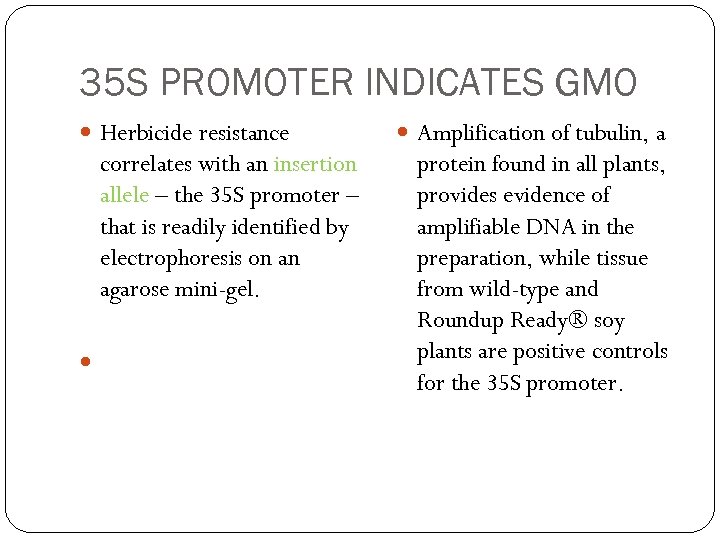 35 S PROMOTER INDICATES GMO Herbicide resistance correlates with an insertion allele – the 35 S promoter – that is readily identified by electrophoresis on an agarose mini-gel. Amplification of tubulin, a protein found in all plants, provides evidence of amplifiable DNA in the preparation, while tissue from wild-type and Roundup Ready® soy plants are positive controls for the 35 S promoter.