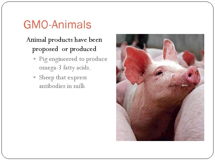 GMO-Animals Animal products have been proposed or produced ▫ Pig engineered to produce omega-3 fatty acids. ▫ Sheep that express antibodies in milk