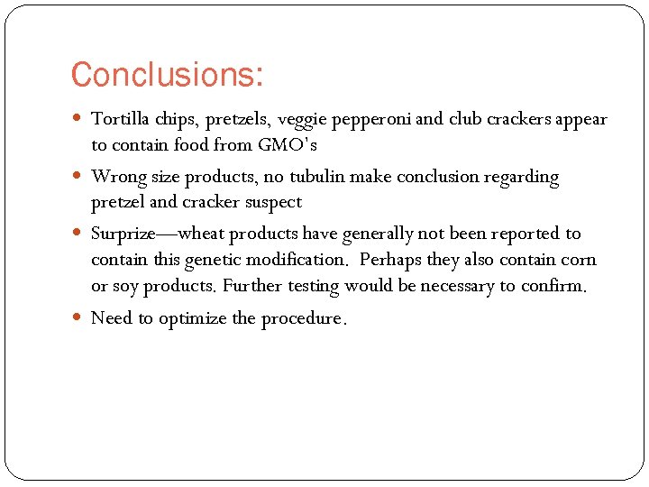 Conclusions: Tortilla chips, pretzels, veggie pepperoni and club crackers appear to contain food from GMO’s Wrong size products, no tubulin make conclusion regarding pretzel and cracker suspect Surprize—wheat products have generally not been reported to contain this genetic modification. Perhaps they also contain corn or soy products. Further testing would be necessary to confirm. Need to optimize the procedure.