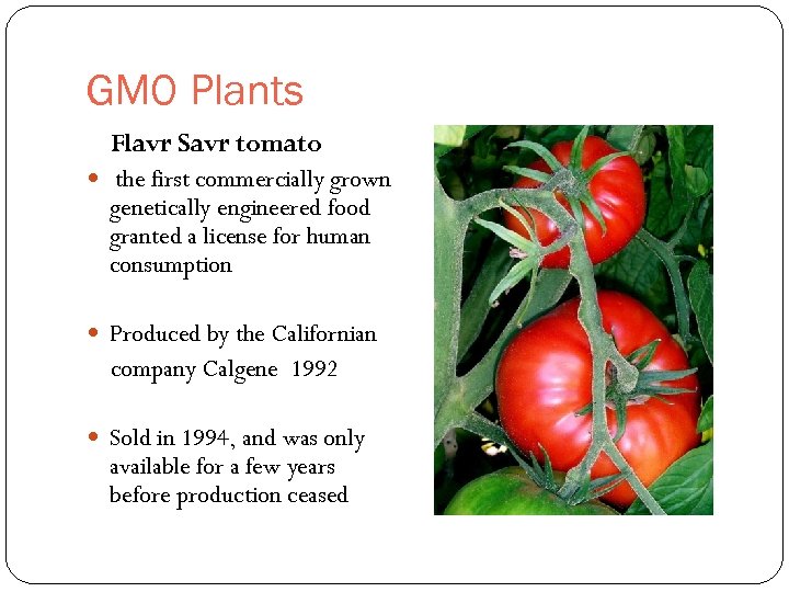 GMO Plants Flavr Savr tomato the first commercially grown genetically engineered food granted a license for human consumption Produced by the Californian company Calgene 1992 Sold in 1994, and was only available for a few years before production ceased