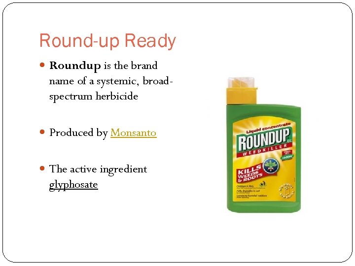 Round-up Ready Roundup is the brand name of a systemic, broadspectrum herbicide Produced by Monsanto The active ingredient glyphosate
