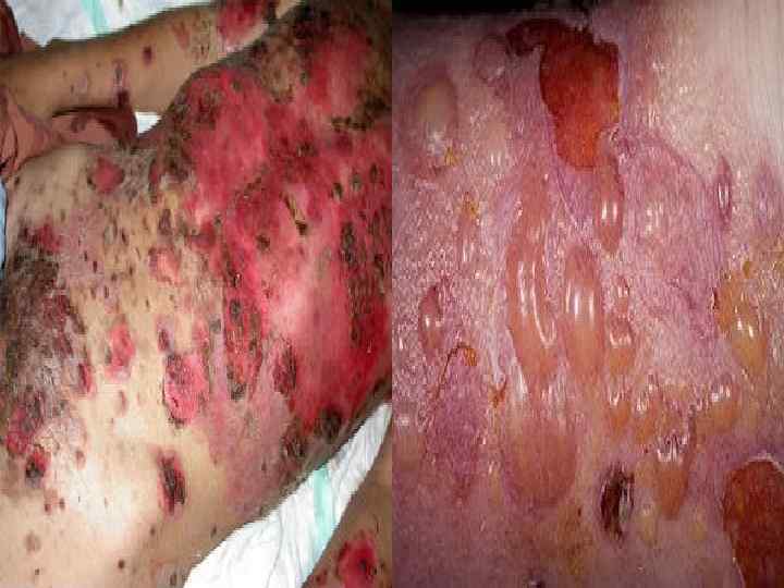 Формы буллезного импетиго Пузырчатка новорожденных (пемфигус). a) Доброкачественая - пузыри 0, 5 -1 см на разных стадиях развития, серозно-гнойное содержимое. Симптом Никольского отрицательный. После вскрытия- эрозии, повышение температуры тела до субфебрильных цифр. Выздоровление через 2 -3 недели. b) Злокачественная – значительное количество больших пузырей – до 2 -3 см в диаметре. Симптом Никольского может быть положительным. Состояние тяжелое, интоксикация, фебрильная температура, возможно развитие сепсиса. В крови- лейкоцитоз, нейтрофилез, сдвиг лейкоцитарной формулы влево, ускоренное СОЭ. n