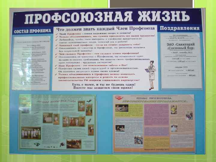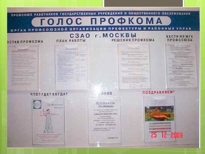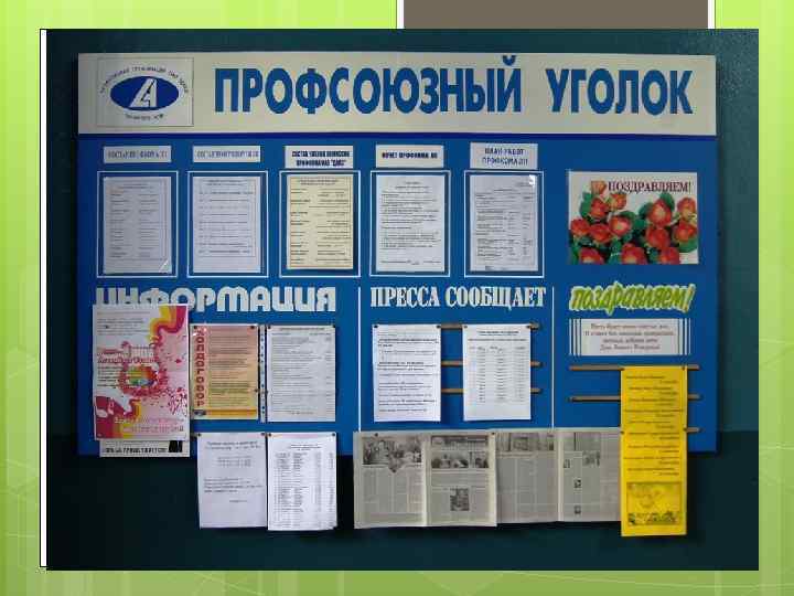 На стенде должно быть - состав профсоюзного комитета с обязанностями - перечень комиссий профкома - план работы профкома и информацию о проводимых мероприятиях - постановления профкома, профсоюзных собраний и результаты их выполнения - полный текст Коллективного договора или отдельные положения - интересные и необходимые материалы из СМИ - объявления