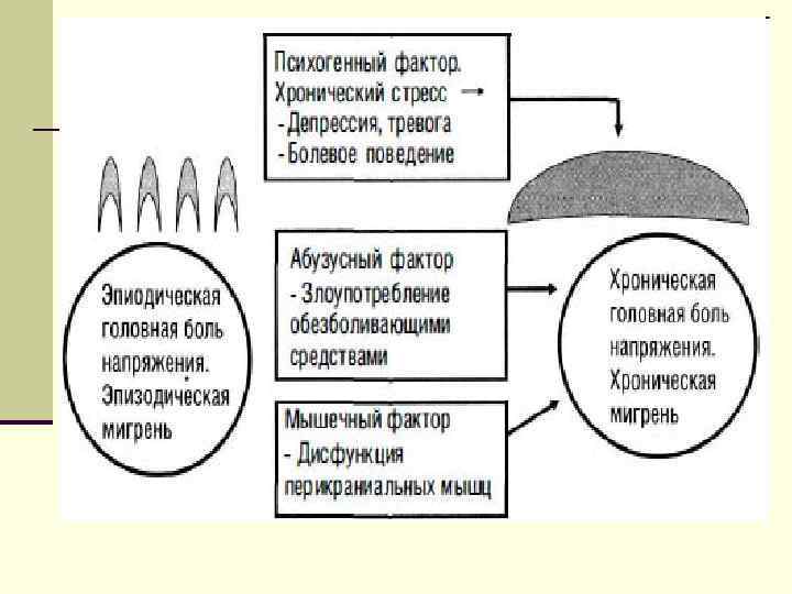 Различия хронической и эпизодической форм ГБН n Эпизодическая форма n Встречается в более молодом n чаще встречается у людей возрасте в возрасте 30 - 40 лет n Меньшая длительность болезни и болевых эпизодов ( 1 -2 раза в n сниженный фон месяц) настроения, тоска, апатия n Длительное напряжение мышц или, наоборот, при антифизиологических позах агрессивность и – провоцирующий фактор раздражительность, n приобретает хроническое течение плохое качество ночного n Часто переходит в хроническую сна. форму n цефалгия возникает в n Хроническая форма течение 15 дней в месяц и более на протяжении в среднем более 3 мес (не менее 1 80 дней в году)
