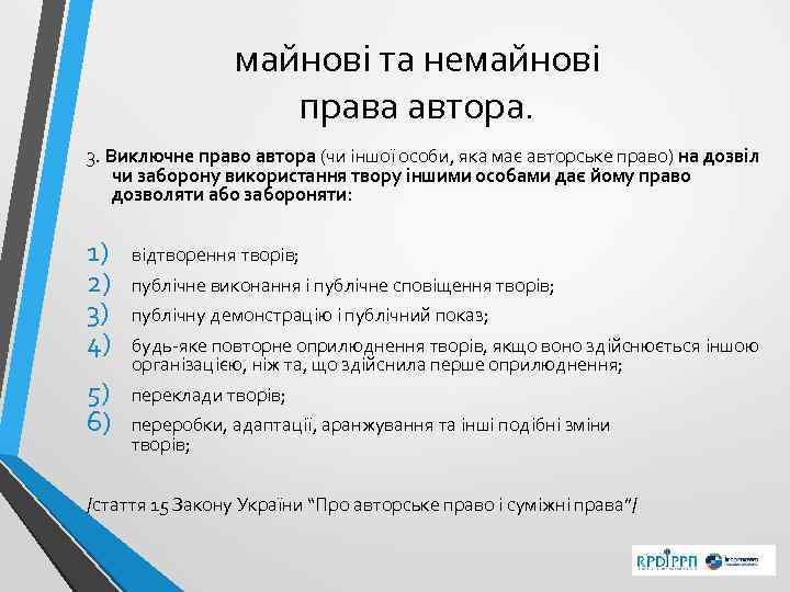 майнові та немайнові права автора. 3. Виключне право автора (чи іншої особи, яка має авторське право) на дозвіл чи заборону використання твору іншими особами дає йому право дозволяти або забороняти: 1) 2) 3) 4) відтворення творів; 5) 6) переклади творів; публічне виконання і публічне сповіщення творів; публічну демонстрацію і публічний показ; будь-яке повторне оприлюднення творів, якщо воно здійснюється іншою організацією, ніж та, що здійснила перше оприлюднення; переробки, адаптації, аранжування та інші подібні зміни творів; /стаття 15 Закону України “Про авторське право і суміжні права”/