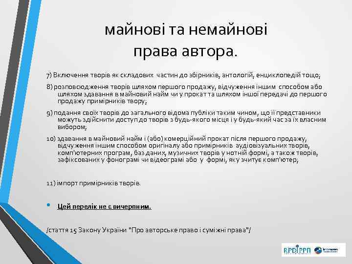 майнові та немайнові права автора. 7) Включення творів як складових частин до збірників, антологій, енциклопедій тощо; 8) розповсюдження творів шляхом першого продажу, відчуження іншим способом або шляхом здавання в майновий найм чи у прокат та шляхом іншої передачі до першого продажу примірників твору; 9) подання своїх творів до загального відома публіки таким чином, що її представники можуть здійснити доступ до творів з будь-якого місця і у будь-який час за їх власним вибором; 10) здавання в майновий найм і (або) комерційний прокат після першого продажу, відчуження іншим способом оригіналу або примірників аудіовізуальних творів, комп'ютерних програм, баз даних, музичних творів у нотній формі, а також творів, зафіксованих у фонограмі чи відеограмі або у формі, яку зчитує комп'ютер; 11) імпорт примірників творів. • Цей перелік не є вичерпним. /стаття 15 Закону України “Про авторське право і суміжні права”/