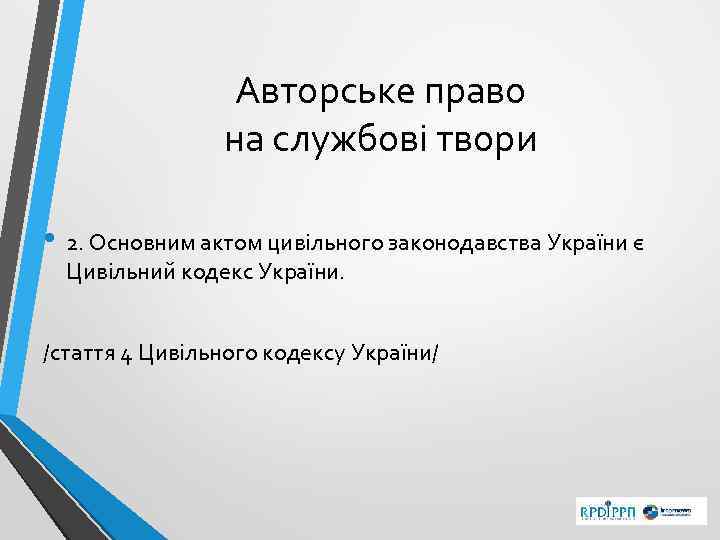 Авторське право на службові твори • 2. Основним актом цивільного законодавства України є Цивільний кодекс України. /стаття 4 Цивільного кодексу України/