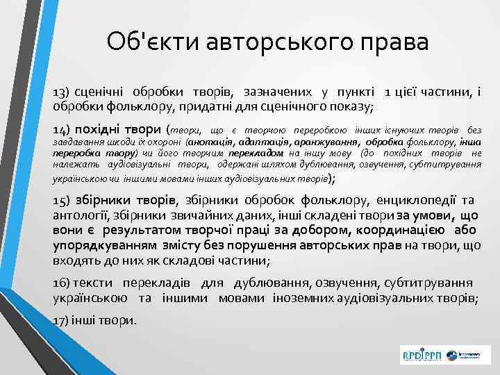 Об'єкти авторського права 13) сценічні обробки творів, зазначених у пункті 1 цієї частини, і обробки фольклору, придатні для сценічного показу; 14) похідні твори (твори, що є творчою переробкою інших існуючих творів без завдавання шкоди їх охороні (анотація, адаптація, аранжування, обробка фольклору, інша переробка твору) чи його творчим перекладом на іншу мову (до похідних творів не належать аудіовізуальні твори, одержані шляхом дублювання, озвучення, субтитрування українською чи іншими мовами інших аудіовізуальних творів); 15) збірники творів, збірники обробок фольклору, енциклопедії та антології, збірники звичайних даних, інші складені твори за умови, що вони є результатом творчої праці за добором, координацією або упорядкуванням змісту без порушення авторських прав на твори, що входять до них як складові частини; 16) тексти перекладів для дублювання, озвучення, субтитрування українською та іншими мовами іноземних аудіовізуальних творів; 17) інші твори.