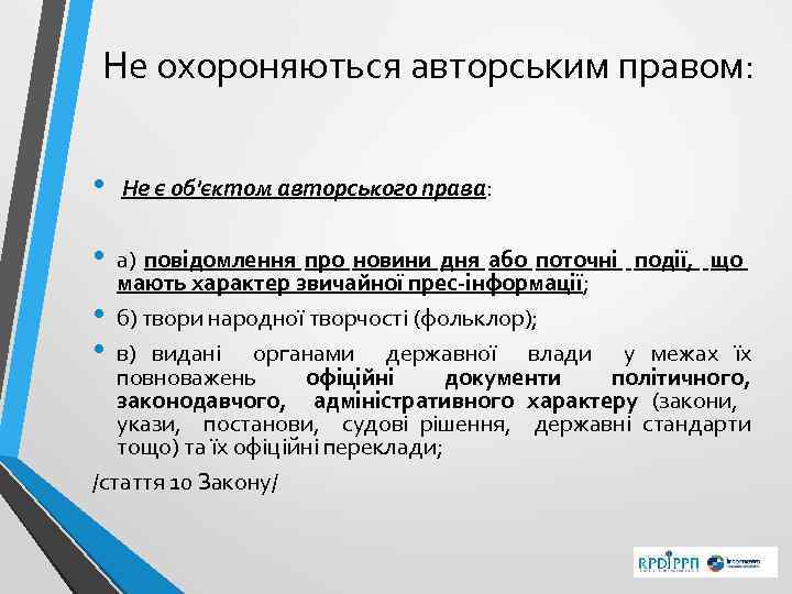 Не охороняються авторським правом: • • Не є об'єктом авторського права: а) повідомлення про новини дня або поточні події, що мають характер звичайної прес-інформації; • б) твори народної творчості (фольклор); • в) видані органами державної влади у межах їх повноважень офіційні документи політичного, законодавчого, адміністративного характеру (закони, укази, постанови, судові рішення, державні стандарти тощо) та їх офіційні переклади; /стаття 10 Закону/