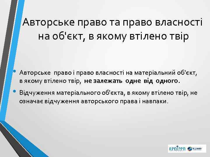 Авторське право та право власності на об'єкт, в якому втілено твір • Авторське право і право власності на матеріальний об'єкт, в якому втілено твір, не залежать одне від одного. • Відчуження матеріального об'єкта, в якому втілено твір, не означає відчуження авторського права і навпаки.