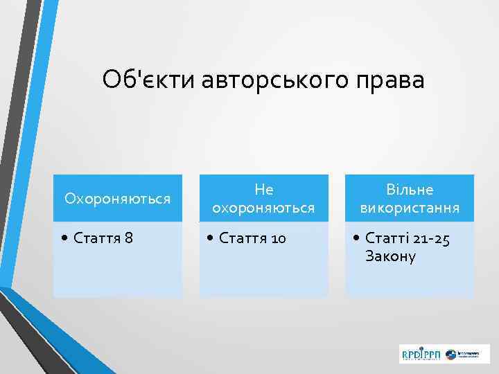 Об'єкти авторського права Охороняються • Стаття 8 Не охороняються • Стаття 10 Вільне використання • Статті 21 -25 Закону