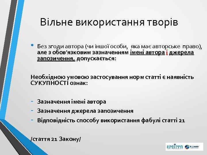 Вільне використання творів • Без згоди автора (чи іншої особи, яка має авторське право), але з обов'язковим зазначенням імені автора і джерела запозичення, допускається: Необхідною умовою застосування норм статті є наявність СУКУПНОСТІ ознак: - Зазначення імені автора Зазначення джерела запозичення Відповідність способу використання фабулі статті 21 /стаття 21 Закону/