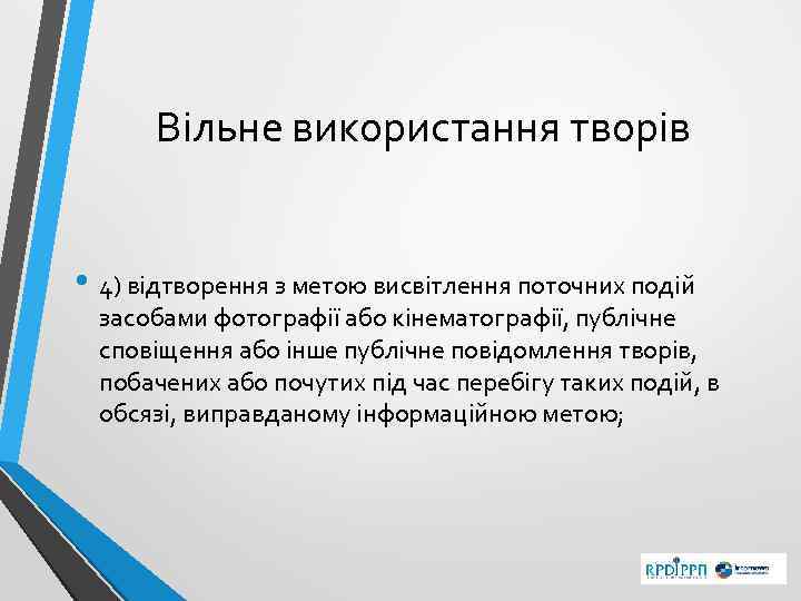 Вільне використання творів • 4) відтворення з метою висвітлення поточних подій засобами фотографії або кінематографії, публічне сповіщення або інше публічне повідомлення творів, побачених або почутих під час перебігу таких подій, в обсязі, виправданому інформаційною метою;