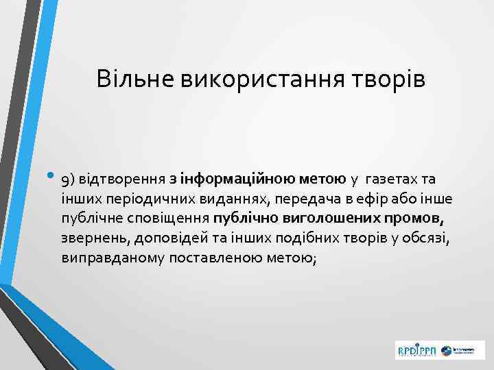Вільне використання творів • 9) відтворення з інформаційною метою у газетах та інших періодичних виданнях, передача в ефір або інше публічне сповіщення публічно виголошених промов, звернень, доповідей та інших подібних творів у обсязі, виправданому поставленою метою;