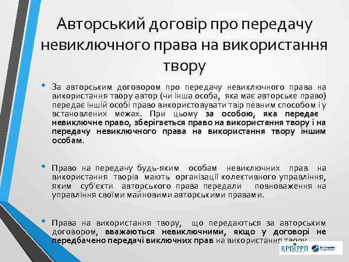 Авторський договір про передачу невиключного права на використання твору • За авторським договором про передачу невиключного права на використання твору автор (чи інша особа, яка має авторське право) передає іншій особі право використовувати твір певним способом і у встановлених межах. При цьому за особою, яка передає невиключне право, зберігається право на використання твору і на передачу невиключного права на використання твору іншим особам. • Право на передачу будь-яким особам невиключних прав на використання творів мають організації колективного управління, яким суб'єкти авторського права передали повноваження на управління своїми майновими авторськими правами. • Права на використання твору, що передаються за авторським договором, вважаються невиключними, якщо у договорі не передбачено передачі виключних прав на використання твору.