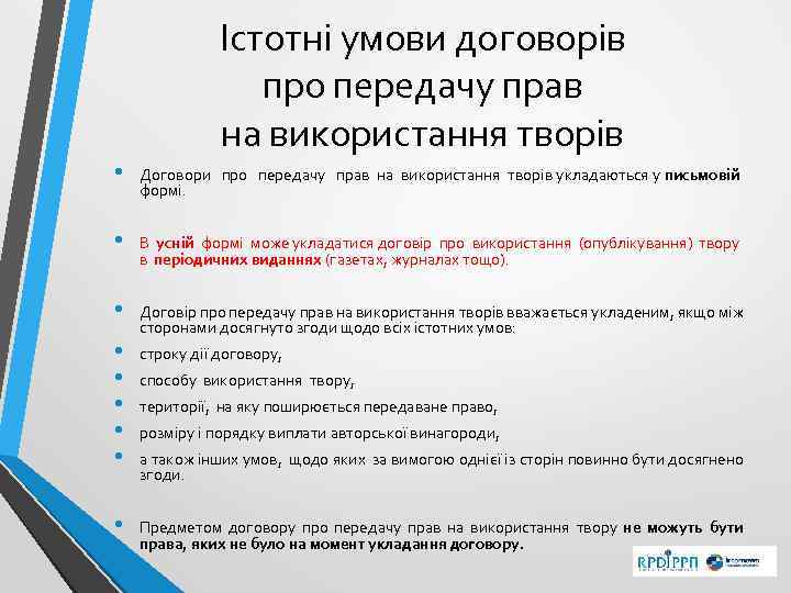 Істотні умови договорів про передачу прав на використання творів • Договори про передачу прав на використання творів укладаються у письмовій формі. • В усній формі може укладатися договір про використання (опублікування) твору в періодичних виданнях (газетах, журналах тощо). • Договір про передачу прав на використання творів вважається укладеним, якщо між сторонами досягнуто згоди щодо всіх істотних умов: • • • строку дії договору, способу використання твору, території, на яку поширюється передаване право, розміру і порядку виплати авторської винагороди, а також інших умов, щодо яких за вимогою однієї із сторін повинно бути досягнено згоди. Предметом договору про передачу прав на використання твору не можуть бути права, яких не було на момент укладання договору.