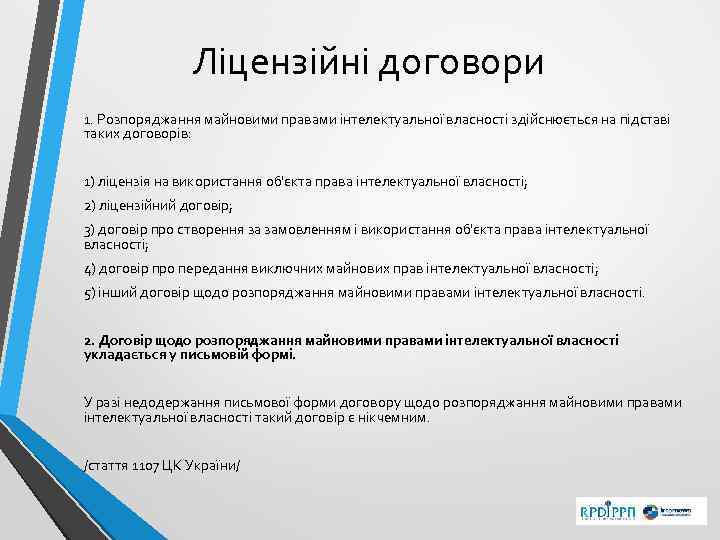 Ліцензійні договори 1. Розпоряджання майновими правами інтелектуальної власності здійснюється на підставі таких договорів: 1) ліцензія на використання об'єкта права інтелектуальної власності; 2) ліцензійний договір; 3) договір про створення за замовленням і використання об'єкта права інтелектуальної власності; 4) договір про передання виключних майнових прав інтелектуальної власності; 5) інший договір щодо розпоряджання майновими правами інтелектуальної власності. 2. Договір щодо розпоряджання майновими правами інтелектуальної власності укладається у письмовій формі. У разі недодержання письмової форми договору щодо розпоряджання майновими правами інтелектуальної власності такий договір є нікчемним. /стаття 1107 ЦК України/