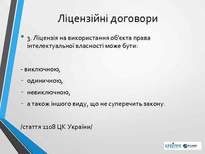 Ліцензійні договори • 3. Ліцензія на використання об'єкта права інтелектуальної власності може бути: - виключною, - одиничною, невиключною, а також іншого виду, що не суперечить закону. /стаття 1108 ЦК України/