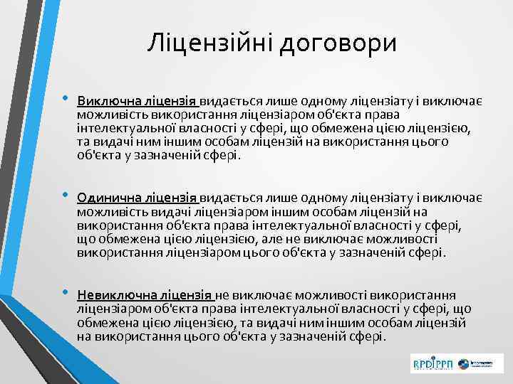 Ліцензійні договори • Виключна ліцензія видається лише одному ліцензіату і виключає можливість використання ліцензіаром об'єкта права інтелектуальної власності у сфері, що обмежена цією ліцензією, та видачі ним іншим особам ліцензій на використання цього об'єкта у зазначеній сфері. • Одинична ліцензія видається лише одному ліцензіату і виключає можливість видачі ліцензіаром іншим особам ліцензій на використання об'єкта права інтелектуальної власності у сфері, що обмежена цією ліцензією, але не виключає можливості використання ліцензіаром цього об'єкта у зазначеній сфері. • Невиключна ліцензія не виключає можливості використання ліцензіаром об'єкта права інтелектуальної власності у сфері, що обмежена цією ліцензією, та видачі ним іншим особам ліцензій на використання цього об'єкта у зазначеній сфері.