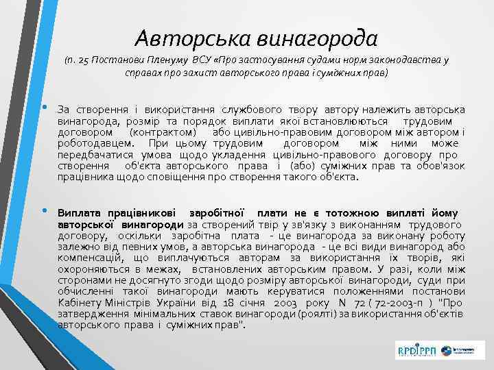 Авторська винагорода (п. 25 Постанови Пленуму ВСУ «Про застосування судами норм законодавства у справах про захист авторського права і суміжних прав) • За створення і використання службового твору автору належить авторська винагорода, розмір та порядок виплати якої встановлюються трудовим договором (контрактом) або цивільно-правовим договором між автором і роботодавцем. При цьому трудовим договором між ними може передбачатися умова щодо укладення цивільно-правового договору про створення об'єкта авторського права і (або) суміжних прав та обов'язок працівника щодо сповіщення про створення такого об'єкта. • Виплата працівникові заробітної плати не є тотожною виплаті йому авторської винагороди за створений твір у зв'язку з виконанням трудового договору, оскільки заробітна плата - це винагорода за виконану роботу залежно від певних умов, а авторська винагорода - це всі види винагород або компенсацій, що виплачуються авторам за використання їх творів, які охороняються в межах, встановлених авторським правом. У разі, коли між сторонами не досягнуто згоди щодо розміру авторської винагороди, суди при обчисленні такої винагороди мають керуватися положеннями постанови Кабінету Міністрів України від 18 січня 2003 року N 72 ( 72 -2003 -п ) "Про затвердження мінімальних ставок винагороди (роялті) за використання об'єктів авторського права і суміжних прав".