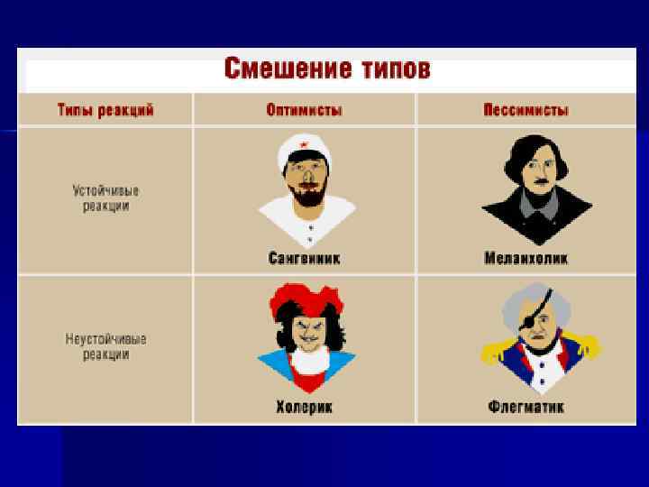 типы ВНД По Гиппократу n Сангвиник n Флегматик n Холерик n меланхолик По Павлову n Живой n Спокойный n Безудержный n Слабый
