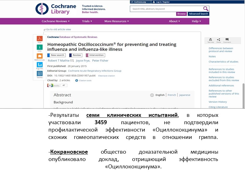 -Результаты семи клинических испытаний, в которых участвовали 3459 пациентов, не подтвердили профилактической эффективности «Оциллококцинума» и схожих гомеопатических средств в отношении гриппа. -Кокрановское общество доказательной медицины опубликовало доклад, отрицающий эффективность «Оциллококцинума».