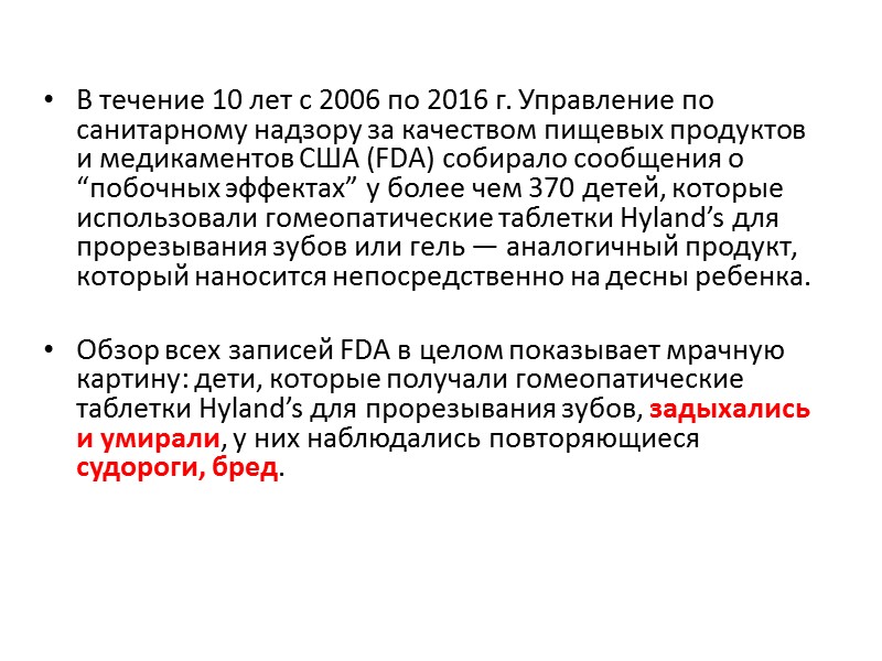 В течение 10 лет с 2006 по 2016 г. Управление по санитарному надзору за качеством пищевых продуктов и медикаментов США (FDA) собирало сообщения о “побочных эффектах” у более чем 370 детей, которые использовали гомеопатические таблетки Hyland’s для прорезывания зубов или гель — аналогичный продукт, который наносится непосредственно на десны ребенка. Обзор всех записей FDA в целом показывает мрачную картину: дети, которые получали гомеопатические таблетки Hyland’s для прорезывания зубов, задыхались и умирали, у них наблюдались повторяющиеся судороги, бред.
