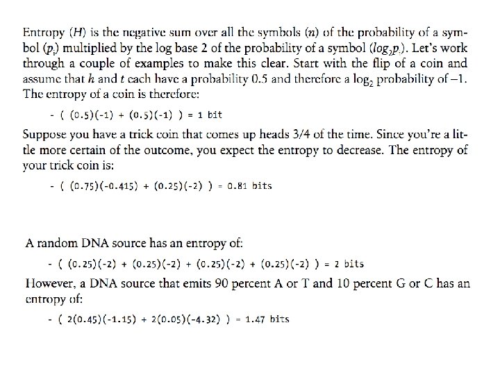 Может быть последовательность цифр кости или ATGC Существует частотное распределение Если равновероятно - 1/n, то H=log 2(n), и среднее будет таким же. Средняя информация последовательности символов называется … ЭНТРОПИЕЙ