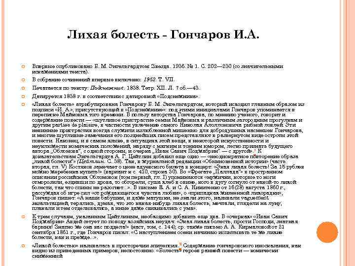 Лихая болесть - Гончаров И. А. Впервые опубликовано Б. М. Энгельгардтом: Звезда. 1936. № 1. С. 202— 230 (со значительными искажениями текста). В собрание сочинений впервые включено: 1952. Т. VII. Печатается по тексту: Подснежник. 1838. Тетр. XII. Л. 7 об. — 43. Датируется 1838 г. в соответствии с датировкой «Подснежника» . «Лихая болесть» атрибутирована Гончарову Б. М. Энгельгардтом, который исходил главным образом из подписи «И. А. » , присутствующей в «Подснежнике» : под этими инициалами Гончаров упоминается в переписке Майковых того времени. В пользу авторства Гончарова, по мнению ученого, говорит и содержание повести — «шутливое пристрастие семьи Майковых к различным загородным прогулкам и другим parties de plaisire, в частности увлечение самого Николая Алоллоновича рыбной ловлей. Эти невинные пристрастия всегда служили излюбленной мишенью для добродушных насмешек Гончарова, и многие шутливые замечания его позднейших писем представляют в развернутом виде остроты этой повести. Наконец, и в самом языке, в ситуациях этой вещи, в некоторой искусственности и неуклюжести комических положений, наряду с мягким и тонким юмором, легко признать будущего автора „Обломова”, с одной стороны, и очерка „Иван Савич Поджабрин” — с другой» . 1 К доказательствам Энгельгардта А. Г. Цейтлин добавил еще одно — «неоднократное повторение образа „лихой болести”» (Цейтлин. С. 38). Так, в журнальной редакции «Обыкновенной истории» (часть вторая, гл. V) Костяков замечает о цене адуевского билета в концерт: «Экая лихая болесть! За 15 рублев можно жеребенка купить!» (вариант к с. 410, строка 30). Во «Фрегате „Паллада”» в пространном описании российских Обломовок (том первый, гл. I) упоминаются «мужички, которые то ноги отморозили, ездивши по дрова, то обгорели, суша хлеб в овине, кого в дугу согнуло от какой-то лихой болести, так что спины не разогнет. . . » . В письме Е. А. и С. А. Никитенко от 16(28) августа 1860 г. , рассуждая об игре сил «от рождающегося чувства любви» , о «припадках жизненной лихорадки» , Гончаров пишет: «А наши бабушки, и даже матушки, не знали этого, называли vaguement экзальтацией, терялись, думая, что это какая-нибудь лихая болесть, мечтали, глядели на луну, плакали и тем отделывались, а иные даже свихивались с ума» . К трем случаям, указанным Цейтлиным, необходимо добавить еще два. В «очерках» «Иван Савич Поджабрин» Авдей сетует по поводу хозяйских неудач: «Экая лихая болесть, прости Господи, знатная барыня! Знатно же она вас поддела!» (наст, том, с. 144); ср. также письмо А. А. Кирмаловой от 21 сентября 1861 г. , где Гончаров писал: «С наступлением осени начинаю испытывать те же лихие болести, как и прежде. . . » . «Лихой болестью» называлась в просторечии эпилепсия. 2 Содержание гончаровского иносказания, как видно из приведенных примеров, непостоянно. «Болесть» героев ранней повести — комически сниженный