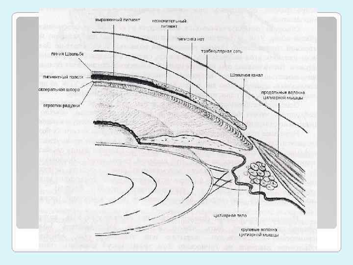 Склеральная шпора (заднее пограничное кольцо Швальбе): тонкий поясок, белый или светло-серый, у пожилых может иметь желтоватый оттенок Цилиарное тело: располагается позади склеральной шпоры, от светло-розового до темно-коричневого цвета, интенсивно пигментировано Радужная оболочка: исследование начинают с центра. По краю зрачка могут быть наложения (псевдоэксфолиации? ), по периферии контур плоский или слегка выпуклый (Hm – выпуклая, М/афакичный глаз – вогнутая) Отростки радужки: при травматической рецессии угла могут отрываться от места прикрепления Ширина УПК: М/афакичный – широкий, Hm – узкий