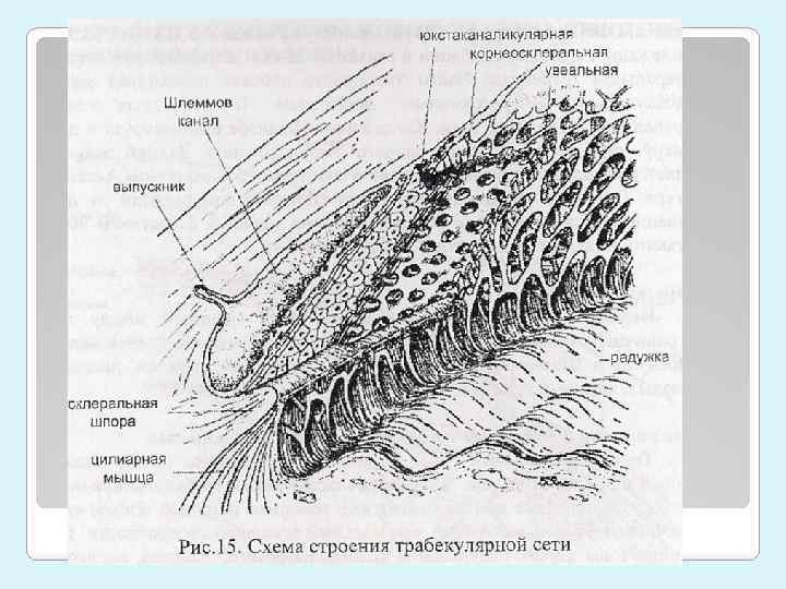 Зона корнеосклеральной трабекулы и Шлеммова канала: Зона корнеосклеральной трабекулы имеет вид широкой бледно-серой или коричневой полосы. Передняя граница обычно гладкая. Трабекула имеет пористое строение, покрывает изнутри Шлеммов канал, имеет 3 слоя: увеальная, корнеосклеральная и эндотелиальная сети. Высота просвета Шлеммова канала до 0, 28 мм, при тяжелом течении глаукомы может сплющиваться. Выделяется более насыщенной серой/коричневой окраской. Могут быть участки пигментированной трабекулярной сети, где ток внутриглазной жидкости выше, чаще при пигментной глаукоме и псевдоэксфолиации капсулы хрусталика