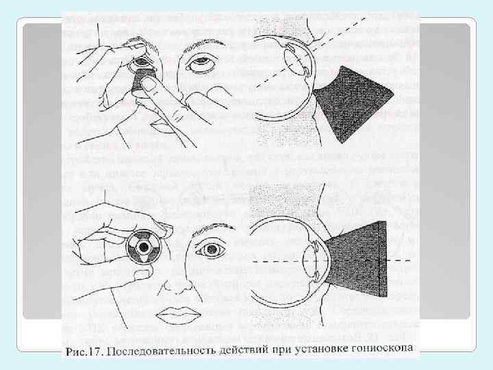 Техника биомикрогониоскопии: Осмотреть передний отрезок глаза через щелевую лампу на наличие атрофии радужки, новообразованных сосудов, признаков травмы или операции. Закапать анестетик. Усадить пациента за щелевую лампу, установить увеличение между 10 и 25, узкий луч 2 -3 мм Прямое зеркальное изображение Исследование с помощью гониоскопа Гольдмана и аналогов: при взгляде пациента вверх приставить нижний край линзы, при переводе взгляда вперед линза «присасывается» к роговице