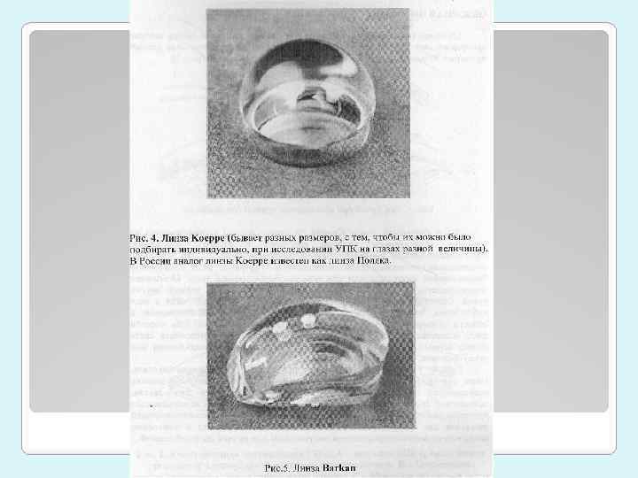 Сравнение прямой и непрямой гониоскопии: Прямая: прямой обзор УПК, панорамность, легко изменять угол наблюдения, возможно использование одновременно 2 линз Коэппа (ех, при односторонней травматической рецессии угла). Но лежа, специальное оборудование Непрямая: удобство, щелевая лампа – и осветитель, и увеличитель. Диф диагностика функциональной и органической блокады УПК – проба Форбса (с надавливанием). Но давление гониоскопа может исказить изображение. Но в настоящее время используют, в основном, непрямую