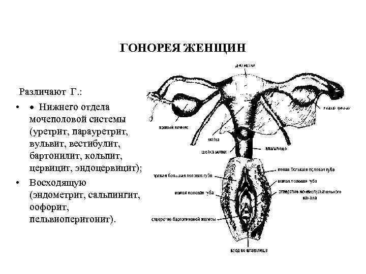 ГОНОРЕЯ ЖЕНЩИН Различают Г. : • · Нижнего отдела мочеполовой системы (уретрит, парауретрит, вульвит, вестибулит, бартонилит, кольпит, цервицит, эндоцервицит); • Восходящую (эндометрит, сальпингит, оофорит, пельвиоперитонит).