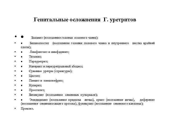 Генитальные осложнения Г. уретритов • · Баланит (воспаление головки полового члена); • • • • · Баланопостит (воспаление головки полового члена и внутреннего листка крайней плоти); · Лимфангоит и лимфаденит; · Тизонит; · Парауретрит; · Кавернит и периуретральный абсцесс; · Сужение уретры (стриктуры); · Цистит; · Пиелит и пиелонефрит; · Куперит; · Простатит; · Везикулит (воспаление семенных пузырьков); · Эпидидимит (воспаление придатка яичка), орхит (воспаление яичка), деференит (воспаление семявыносящего протока), фуникулит (воспаление семенного канатика); Проктит.