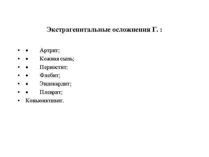 Экстрагенитальные осложнения Г. : • • · Артрит; · Кожная сыпь; · Периостит; · Флебит; · Эндокардит; · Плеврит; Коньюнктивит.