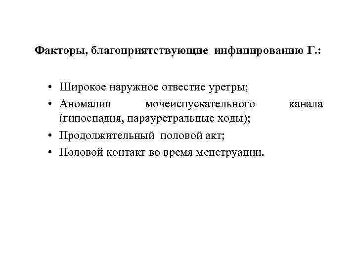 Факторы, благоприятствующие инфицированию Г. : • Широкое наружное отвестие уретры; • Аномалии мочеиспускательного (гипоспадия, парауретральные ходы); • Продолжительный половой акт; • Половой контакт во время менструации. канала