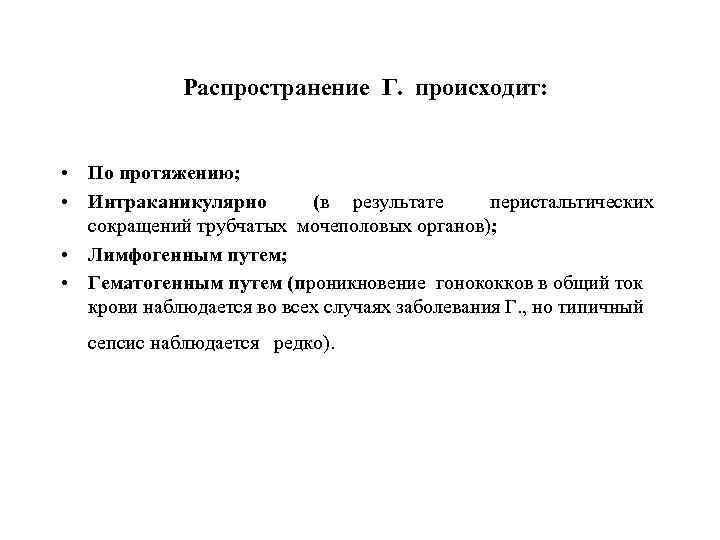 Распространение Г. происходит: • По протяжению; • Интраканикулярно (в результате перистальтических сокращений трубчатых мочеполовых органов); • Лимфогенным путем; • Гематогенным путем (проникновение гонококков в общий ток крови наблюдается во всех случаях заболевания Г. , но типичный сепсис наблюдается редко).