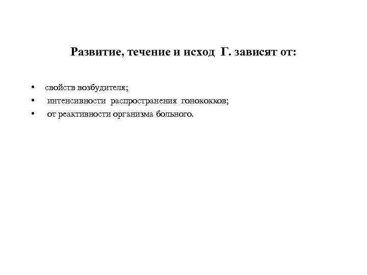 Развитие, течение и исход Г. зависят от: • • • свойств возбудителя; интенсивности распространения гонококков; от реактивности организма больного.