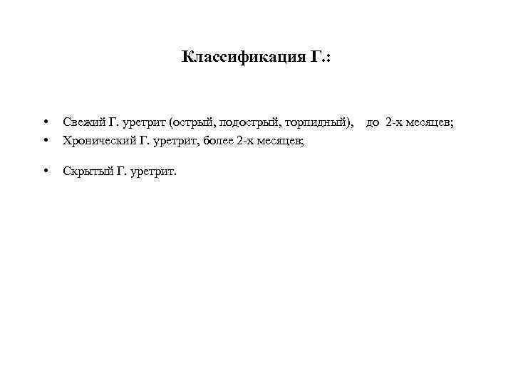 Классификация Г. : • • Свежий Г. уретрит (острый, подострый, торпидный), до 2 -х месяцев; Хронический Г. уретрит, более 2 -х месяцев; • Скрытый Г. уретрит.