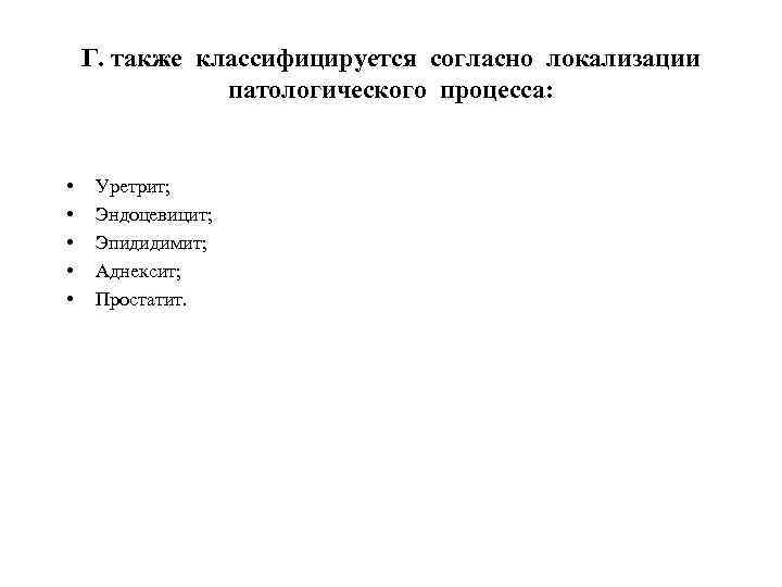 Г. также классифицируется согласно локализации патологического процесса: • • • Уретрит; Эндоцевицит; Эпидидимит; Аднексит; Простатит.