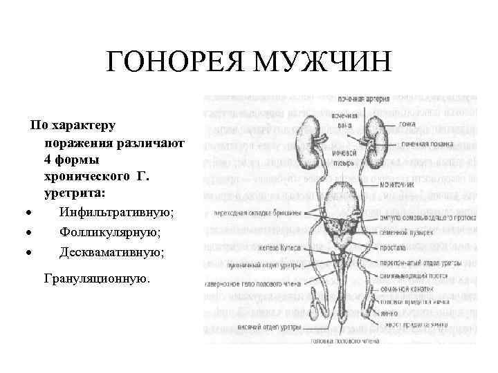 ГОНОРЕЯ МУЖЧИН По характеру поражения различают 4 формы хронического Г. уретрита: · Инфильтративную; · Фолликулярную; · Десквамативную; Грануляционную.