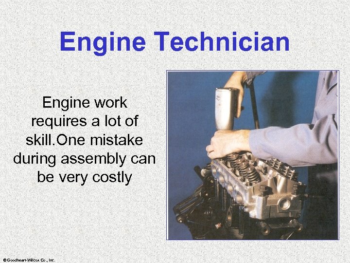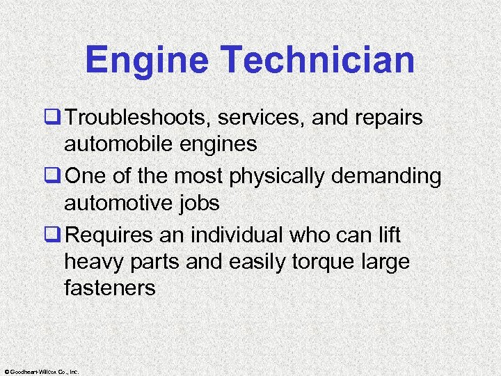 Engine Technician q Troubleshoots, services, and repairs automobile engines q One of the most physically demanding automotive jobs q Requires an individual who can lift heavy parts and easily torque large fasteners © Goodheart-Willcox Co. , Inc.
