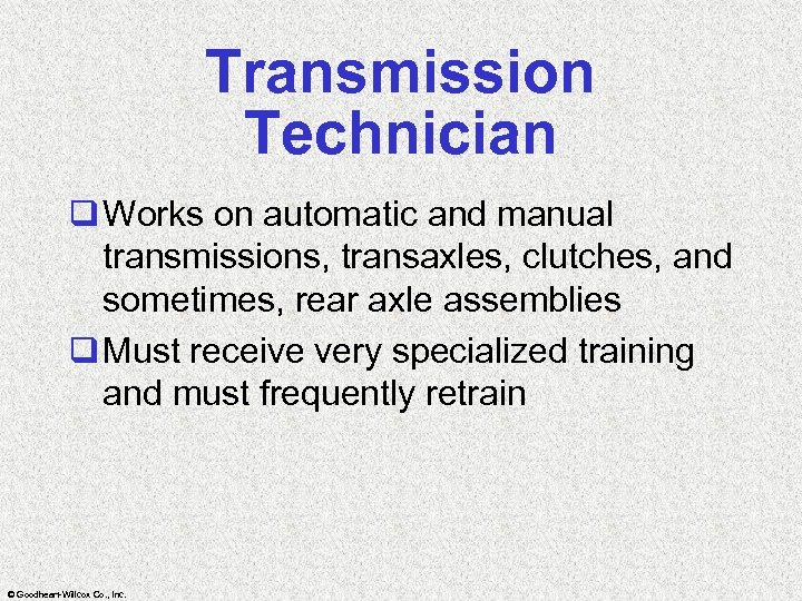 Transmission Technician q Works on automatic and manual transmissions, transaxles, clutches, and sometimes, rear axle assemblies q Must receive very specialized training and must frequently retrain © Goodheart-Willcox Co. , Inc.