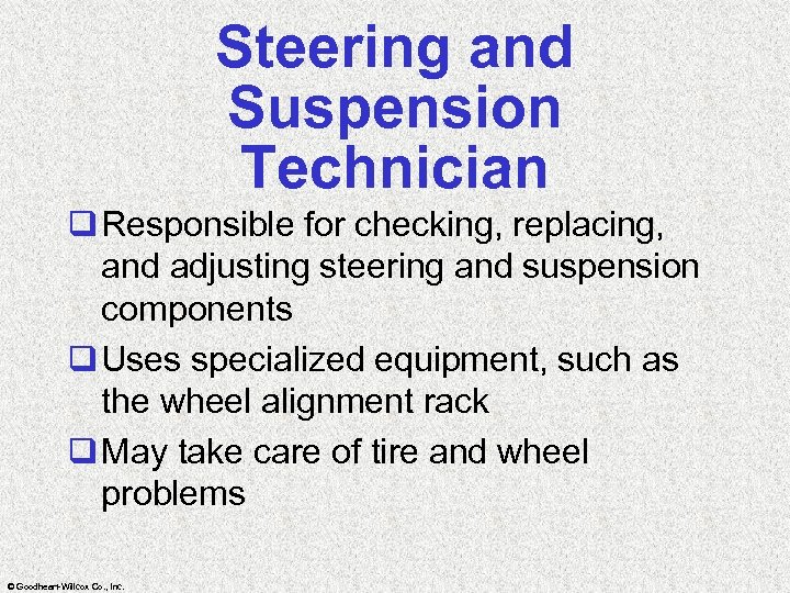 Steering and Suspension Technician q Responsible for checking, replacing, and adjusting steering and suspension components q Uses specialized equipment, such as the wheel alignment rack q May take care of tire and wheel problems © Goodheart-Willcox Co. , Inc.